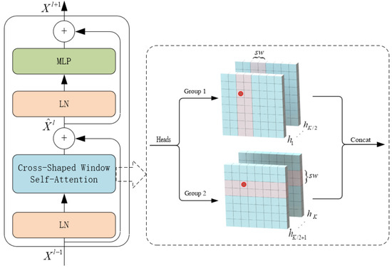 The CSWin transformer block (CTB) consists of 2 layers of LayerNorm (LN), cross-shaped window self-attention, multi-layer perceptron (MLP), and skip connections. As shown in Figure 2. CTB is built based on the cross-shaped windows attention mechanism, its input and output dimensions are consistent, and the operation process is expressed by Equation (1).