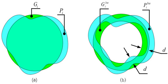Inspired by the Dice loss function proposed in [24] and combining the OCT fundus image segmentation task with high requirements for edge segmentation, we designed a Dice loss function based on the edge area, named BoundaryAreaDiceLoss (). This loss function can guide the model to learn more about the edge area features of the retinal layer to improve the accuracy of edge segmentation. As shown in Figure 3a, cyan is the prediction of the i-th category and green is the ground truth for which we take the area whose edge width is d, as shown in Figure 3b, to calculate the Dice loss. is represented by Equation (4).