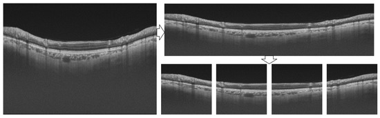 Due to the high resolution of sample images and the limitation of GPU memory, the batch size must be reduced in the training stage. If the batch size is too small, the convergence of the model will be unstable [31], and if it is too large, the convergence will be slow [32]. To solve this problem, we intercept the range of pixel index 63–613 in the length direction of the original image, which can include all retinal layer areas to obtain a new length size of 550 and then downsize it to 256. Meanwhile, the width direction is directly reduced to 1024. The newly generated size is 256 × 1024. Then, divide the image into four non-overlapping parts, each with a size of 256 × 256. The processing flow is shown in Figure 4.