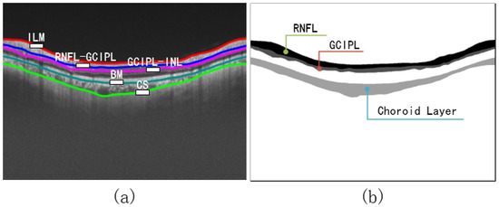 (a) OCT image with boundary naming. (b) Labels with instructions for retinal layers. The edge of each retinal layer in (a) is extracted from (b) using the Canny [33] algorithm.