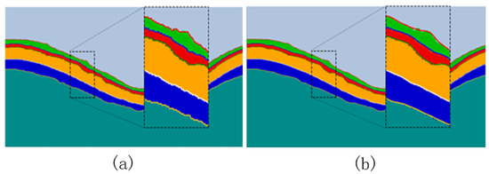 The output of the proposed neural network in the last PEC layer is the pixel-level segmentation prediction map of each sub-eye layer. However, the edges between layers need further processing to obtain. We first use the Canny algorithm [33] to extract edge pixels, which will result in jagged edges because pixels cannot be further divided. These edges are then fitted by the Savitzky–Golay [34] algorithm to obtain smooth retinal layer edges. The Savitzky–Golay filtering algorithm is a window-based data weighting filter that performs polynomial fitting according to the least squares method. It can improve the accuracy of the data without changing the signal trend and width, which can be expressed by Equation (6). We set the window size to 33, and the result is shown in Figure 6.