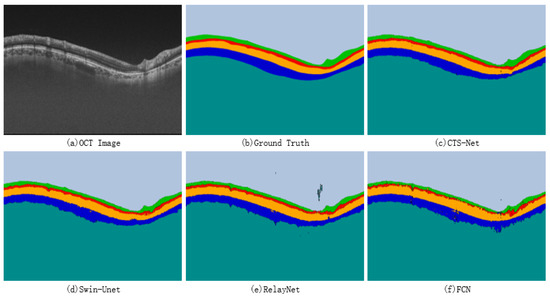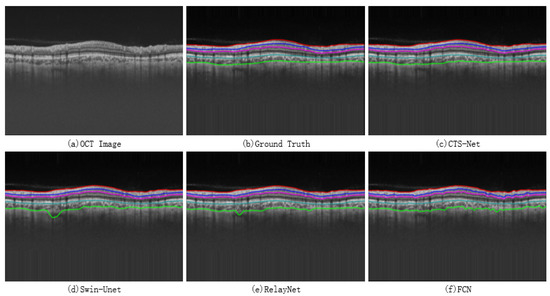 To verify the effectiveness of our method, we compared it with three start-of-the-art models, namely, FCN [35], RelayNet [36], and Swin-Unet. FCN is a neural network model built with convolution as the backbone network and was employed to segment retinal layers. RelayNet is also a fully convolutional neural network model that can perform pixel-level segmentation of retinal layers. Swin-Unet is a U-shaped model with Swin Transformer as the backbone network, which first achieved good results in heart segmentation and multi-organ segmentation tasks and was later applied to various medical image segmentation tasks.