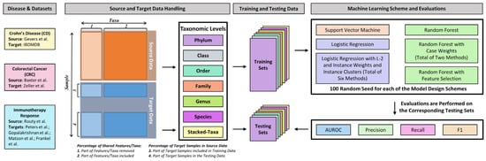 In this study, we evaluated the efficacy of a leveraging scheme, wherein we constructed our predictive models by combining a portion of external data (target data) into a larger and independent data set (source data) for prediction and evaluation of the remaining portion of the external (target) data. The aim of this approach is to establish evidential relationships between microbial data from larger datasets, therefore enhancing the cross-study prediction performance and enabling the machine learning model to exhibit greater generalizability. Furthermore, this leveraging scheme approach offers a solution to the three previously identified problems. Similar leveraging schemes have been employed in the prediction of hospital records, demonstrating their viability [,], and this would be the first time records are evaluated using microbial data. We included nine different and independent 16S rRNA studies with three different diseases of interest: colorectal cancer (CRC), Crohn’s disease (CD), and immunotherapy response. We examined a number of factors that could affect the leveraging model prediction performances: 1. percentage of shared taxa between the source and target data (6 levels); 2. percentage of target samples in the source data (6 levels); 3. individual taxonomic levels and a stacked-taxa in which we combined data from phylum to species levels (7 levels). For each of these combinations, we used 100 iterations to draw different target samples for evaluation randomly, and each generated 468 unique training and testing dataset pairs for the evaluation of 13 machine learning methods. Our previous work confirmed good performance for random forest models on higher taxonomic levels, i.e., phylum []. For example, the lowest intra-study AUROC on the phylum level was around 0.75, which gradually increased to reach 0.875 at the genus level for the classification of Crohn’s disease. As a result, we can harness more information by stacking these taxonomic levels together to gain better model interpretability. In addition, our previous study also illustrated the importance of studying the taxa–taxa relationship from the cross-taxonomic level perspective, as individual species or groups of species under the same family could both play major roles in disease differentiation within machine learning models []. In the results, we showed this stacked-taxa dataset has competitive results to the genus level performance and can be used to identify generalizable and consistent taxa.