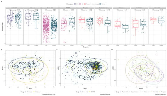 As depicted in Figure 2A, the alpha diversity of most datasets at the genus level showed no significant differences, with the exception of the datasets from IBDMDB [] and Gopalakrishnan et al. [], which had Wilcoxon p-values of 0.046 and 0.019, respectively. In contrast, both the CRC (Figure 2B) and immunotherapy response (Figure 2D) datasets demonstrated significant differences between the studies at the genus level, with p-values less than 0.001. By contrast, the Crohn’s disease (Figure 2C) datasets showed no significant differences between the studies, with a p-value of 0.81.