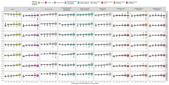Area under the receiver operating curve for selected machine learning methods across different examined combinations. The x-axis represents the percentage of target samples combined into the source data to form the training data frame, which ranged from 0% (baseline, no leveraging) to 90%. The y-axis represents the area under the receiver operating curve, and the solid black dot represents the outliers. The plot illustrated the results from 75% of features/taxa shared between two colorectal cancer datasets.