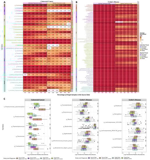 For CRC, as shown in Figure 5A, the genus-level taxa Fusobacterium [,], Pavimonas [,], Peptostreptococcus [], and Porphyromonas [] (and Porphyromonas asaccharolytica []) are stable for both individual taxonomic and stacked-taxa levels models, and these are known to be associated with colorectal cancer. In Figure 5B, the importance for all individual taxonomic levels is rounded up to 1.00, indicating minimal impact with adding the target samples, and this is likely due to the much smaller target sample size compared to the source. The importance trends are more obvious in the stacked-taxa results. We focus on the genus-level taxa, which did not greatly lose more than 0.15 of their importance with the addition of target samples. These consistent taxa include many genus taxa that have documented connections with inflammatory bowel disease: the Eubacterium eligens group [], the Ruminoccocus torques group [], Agathobacter [], Bacteroides [,,], Blautia [,], Butyricicoccus [], Fusicatenibacter [], Intestinibacter [], Lachnospira [], the Lachnospiraceae_NK4A136 group, Lachnospiraceae_UCG-008, Monoglobus [], and Roseburia [,,,]. The log-transformed relative abundances of these taxa from CRC and CD were illustrated in Figure 5C, and most of these consistent taxa were differentially abundant between the corresponding disease and control. Statistically significant differential taxa in both source and target are important for biomarker discovery for generalizable markers across studies. The ANCOM-BC results shown in Figure 5C identified many of these top-ranked taxa were differentially abundant between the case and controls from source or target datasets.