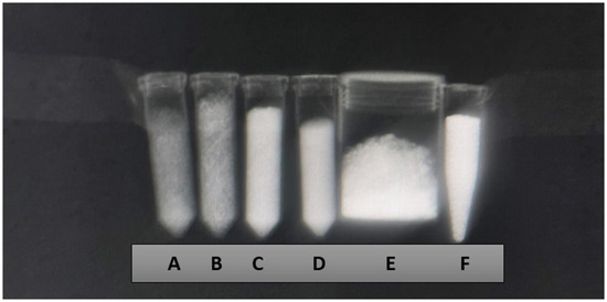 X-ray imaging using the wrist technique (mAs 20, ms 71, and 46 Kv) of the samples Zn-HA 10% (A), Sr-HA 10% (B), HA 01.256 CTT 1000 °C (C), HA microspheres (D), AuNP (E), and Cu-GO (F).