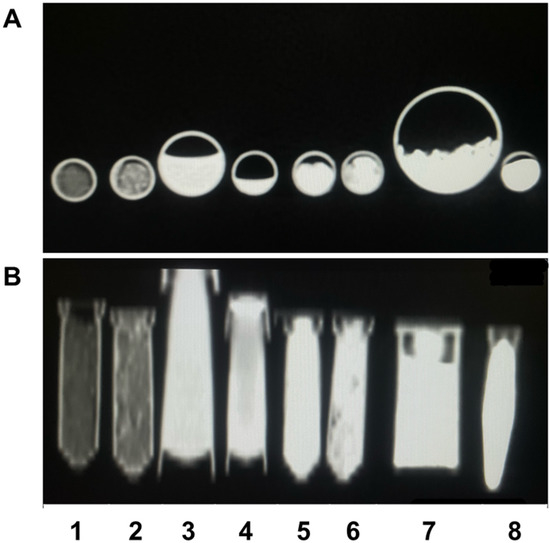 CT imaging showing axial section (A) and coronal section (B) of the samples Zn-HA 10% (1), Sr-HA 10% (2), HA 282 STT (3), HA 212 500 °C (4), HA 01.256 CTT 1000 °C (5), HA microspheres (6), AuNP (7), and Cu-GO (8).
