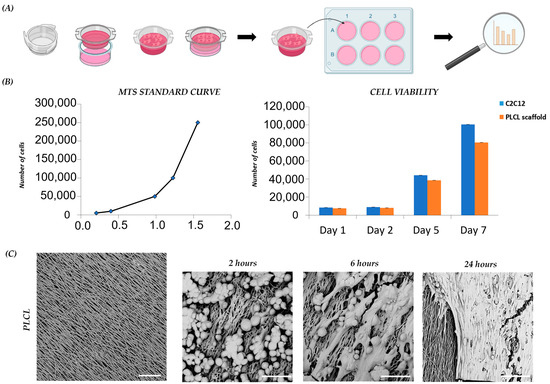 C2C12 proliferation and morphology on scaffolds: (A) schematic diagram of PLCL scaffold preparation for C2C12 culture; (B) C2C12 viability and proliferation on scaffold and control on day 1, day 2, day 5 and day 7 of culture; (C) representative SEM images of PLCL scaffold before and after cell seeding, capturing C2C12 morphology after 2, 6 and 24 h. Scale bars: 25 µm.