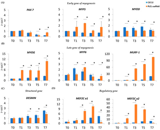 Real-time q-PCR of MRFs, muscle-specific proteins and MEF transcript levels in C2C12 on the scaffold and C2C12 control during myogenic differentiation. (A) Transcript levels of early MRFs and (B) late MRFs immediately after 24 h of differentiation (T1), during differentiation (T3–T5) and during late stages of differentiation (T7). (C) Expression of a structural gene after 24 h of differentiation (T1), during differentiation (T3–T5) and during late stages of differentiation (T7). (D) Expression of MEF after 24 h of differentiation (T1), during differentiation (T3–T5) and during late stages of differentiation (T7). * Data are representative of three experiments and expressed as means ± SD; the level of significance was set at p < 0.05.