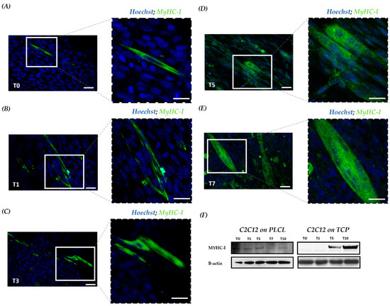 To better understand the myogenesis of the cell-laden PLCL scaffold, confocal imaging of fluorescently stained myosin heavy chain 1 (MyHC-1) was assessed. MyHC-1 is a muscle-specific protein that started to increase or to be expressed from T5 to T10 [35]. In particular, at T0, undifferentiated C2C12 showed no cells positive for MyHc-1, whereas few differentiated cells positive for MyHC-1 were detected on the scaffold (Figure 4A). These data are consistent with our previous in vitro analysis, supporting the role of the PLCL scaffold in guiding C2C12 morphogenesis and accelerating cell organization with enhanced cell differentiation. At T1, more positive MyHC-1 cells were observed in C2C12 cultured on the PLCL scaffold (Figure 4B). At T3, as expected, fused myocytes and few myotubes were present (Figure 4C), whereas at T5, mature myotubes spread all over the scaffold (Figure 4D). In general, T5 in vitro is considered an intermediate time point of myogenesis; however, with the PLCL scaffold, it appeared as the final stage of differentiation. Stable myotubes were detected at T7, with a reduction in positive MyHC-1 confirming the hypothesis of an early differentiation pathway (Figure 4E). Moreover, Western blot (WB) analysis revealed that C2C12 on the scaffold exhibited a constant expression of MyHC-1, whereas the control exhibited MyHC-1 from T5 to T10 (Figure 4F). Collectively, a steady staining of MyHC-1 in aligned myotubes was observed for the PLCL scaffold throughout the cell lineage, proving that a scaffold can yield mature myoblasts within 5 days—half the time of the control.