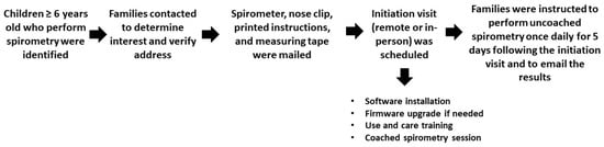 This program was implemented at the Pediatric Cystic Fibrosis Care Center at Arkansas Children’s Hospital, the only pediatric care center in the state of Arkansas accredited by the Cystic Fibrosis Foundation. The local institutional review board (University of Arkansas for Medical Sciences, Little Rock, AR, USA) deemed this activity not to constitute human research. The program was developed in collaboration between the Care Center, the Respiratory Care Department, and the Pulmonary Diagnostic Laboratory (Figure 1). Firstly, the families of people with cystic fibrosis 6 years or older who had previously been able to successfully perform spirometry were identified and contacted to verify their interest in participating in the home spirometry program and a delivery address. The families who agreed to have access to home spirometry were mailed a spirometry unit, nose clips, a printed copy of updated hardware and software instructions, and a measuring tape for height measurement at home, in case a significant delay between the clinic and home spirometry occurred. The latter was performed in case too much time elapsed between the 2 different measurements []. An appointment was scheduled with a designated respiratory therapist to conduct either a virtual (required 2 devices: one for spirometry and the other to provide real-time coaching) or an in-person standardized initiation visit. The initiation visit typically lasted 45–60 min. However, the virtual initiation often required some additional time due to connectivity issues. Only 2 respiratory therapists, who followed a checklist (Checklist S1 in Supplementary Materials), were assigned to the program to provide consistency. In-person initiation visits were followed up by remote communications to troubleshoot any connectivity problems. During the initiation visit, the device was set up and a software installation and firmware upgrade were conducted if needed. The child and family were trained on how to use and care for the home spirometer. The differences in technique between the maneuver they were used to (tidal breathing before maximal inhalation) and the maneuver required for the home spirometry were explained and demonstrated by patients. This was followed by children performing a coached home spirometry session. The latter was completed when either acceptability/reproducibility were achieved or 8 spirometric maneuvers were completed. During coached maneuvers, the respiratory therapist observed the child performing the maneuver and provided verbal instructions regarding the timing of different steps. Specifically, the respiratory therapist encouraged the child to inhale deeply and forcefully exhale as long as possible, consistent with a spirometry performed at the clinic. The families were instructed to have the child perform daily uncoached spirometry for 5 days following the initiation visit. No reminders were sent by either the respiratory therapist or the spirometry software. The ZephyRx MIR Spirobank Smart Spirometer (Troy, NY, USA) with a reusable turbine and mouthpiece (Figure 2) provided by the Cystic Fibrosis Foundation was utilized for the home spirometry program. This device used the usability and acceptability criteria established by the 2019 American Thoracic Guidelines []. The devices were connected to a web-based dashboard where spirometry data were stored. The use of the dashboard was initially free, but the company later changed to a usage-fee model. At the time these data were obtained, the home spirometer did not allow in-app coaching, but this feature was added in later software versions. Families were instructed to email results to the Pulmonary Diagnostic Laboratory through the spirometry software. This was conducted in case we were not able to use the dashboard in the future. While uploading the data to the dashboard occurred automatically, emailing the spirometry data required an extra step from the participants. Global Lung Initiative reference equations were used to determine the percent predictive values [].