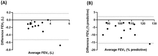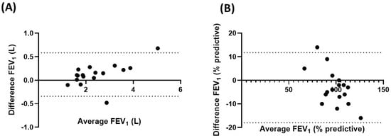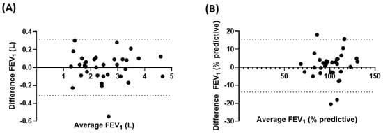 Bland-Altman plot for FEV1 obtained during coached home spirometry and clinic spirometry sessions. FEV1 = forced expiratory volume in the first second; (A) absolute value (L); (B) percent predictive value.