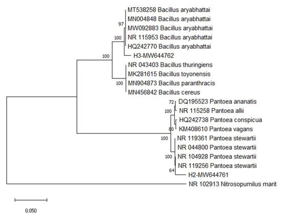 The findings led to strains H2 and H3 being categorized as Bacillus and Actinomyces species. Isolated bacteria were recognized at the molecular level by 16S rRNA gene sequencing for further verification. The 16S rRNA gene was sequenced after the genomic DNA was extracted, amplified, and purified. Based on a similarity search and phylogenetic analysis, the sequence was deposited in Genbank, and the accession numbers (MW644761 for strain H2 and MW644762 for strain H3) were determined. Pantoea stewartii and Priestia aryabhattai were the closest to 100% similarity to H2 and H3, respectively (Figure 1). The Pantoea stewartii strain and the Priestia aryabhattai strain were determined to be strains H2 and H3 based on conventional and molecular identification data.