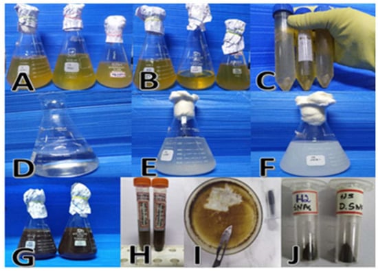 Synthesis of silver nanoparticles using Pantoea stewartii and Priestia aryabhattai ((A)—bacterial broth culture of Pantoea stewartii; (B)—Priestia aryabhattai; (C)—bacterial pellet; (D)—distilled water; (E)—bacterial pellet and distilled water; (F)—bacterial pellet, distilled water, and 1 mM silver nitrate; (G)—broth changed to dark brown color, indicating silver nanoparticle synthesis; (H)—separated nanoparticle; (I)—dried silver nanoparticles; (J)—powder form of silver nanoparticles).