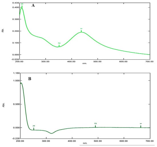 UV–visible spectra of (A) Pantoea stewartii- and (B) Priestia aryabhattai-synthesized silver nanoparticles.