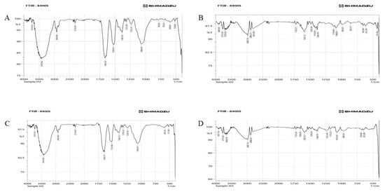 FT-IR spectra of (A) Pantoea stewartii-synthesized silver nanoparticles, (B) pellet of Pantoea stewartii, (C) Priestia aryabhattai-synthesized silver nanoparticles, and (D) pellet of Priestia aryabhattai.