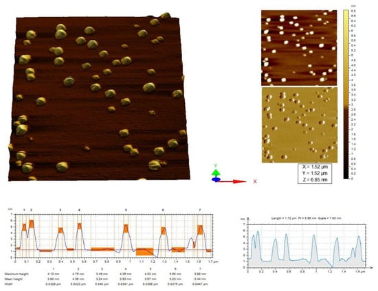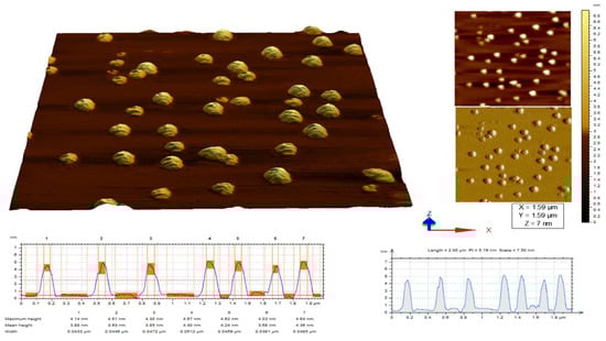 AFM was performed for the morphological study of Pantoea stewartii- and Priestia aryabhattai-synthesized silver nanoparticles. Both bacterially synthesized Ag NPs were circular-shaped and disaggregated with a size distribution in the range of 4 nm (Pantoea stewartii) and 3.6 nm (Priestia aryabhattai) (Figure 5 and Figure 6).