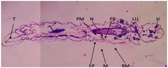 Histopathological images of fourth-instar larvae of non-treated Ae. aegypti larvae (epithelial cells—EP; peritrophic membrane—PM; food bolus—FB; basement membrane—BM; muscles—M; nucleus—N; LU—gut lumen).