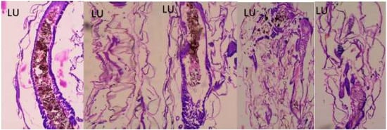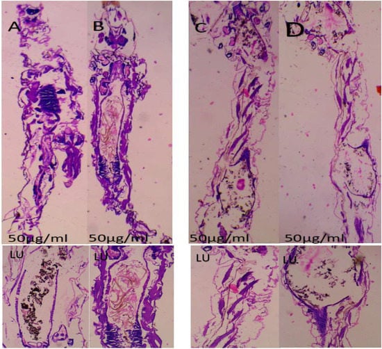 Histological analysis of silver-nanoparticle-exposed mosquito larvae was performed. A 10% buffered formaldehyde solution was used to store the afflicted larvae for 24 h before they were dehydrated using an ethanol series and finally cleaned using xylene solutions. At the embedding stage, melted paraffin was used to embed them inside the block permanently. Hematoxylin and eosin were used to stain the paraffin blocks, and sections were cut from them at a thickness of 5 m using a rotary microtome. The effects of the extract’s toxicity on larvae were observed at a magnification of 40× under a bright-field light microscope. Under a stereomicroscope, the extract-induced accumulation of tissue and its modifications were observed [66].