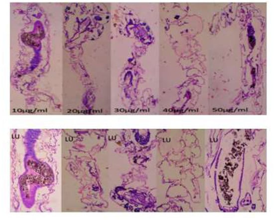 Longitudinal section and midgut lumen of an Aedes aegypti larva exposed to different concentrations of Pantoea stewartii-mediated silver nanoparticles.