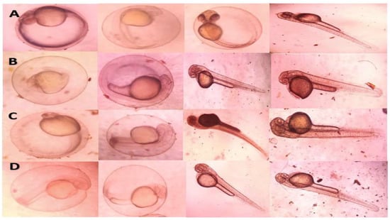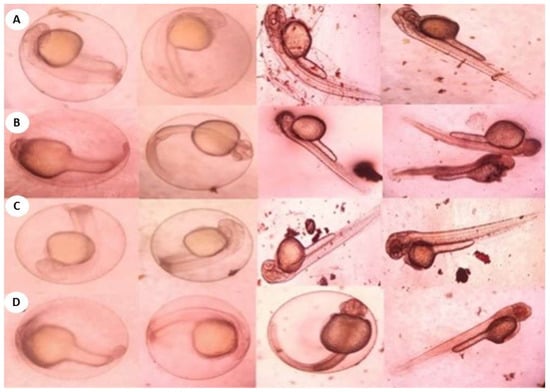 Representative images of embryos exposed to Pantoea stewartii-synthesized silver nanoparticles (Ag NPs) at 120 hpf: (A)—10 µg/mL; (B)—20 µg/mL; (C)—30 µg/mL; and (D)—50 µg/mL.
