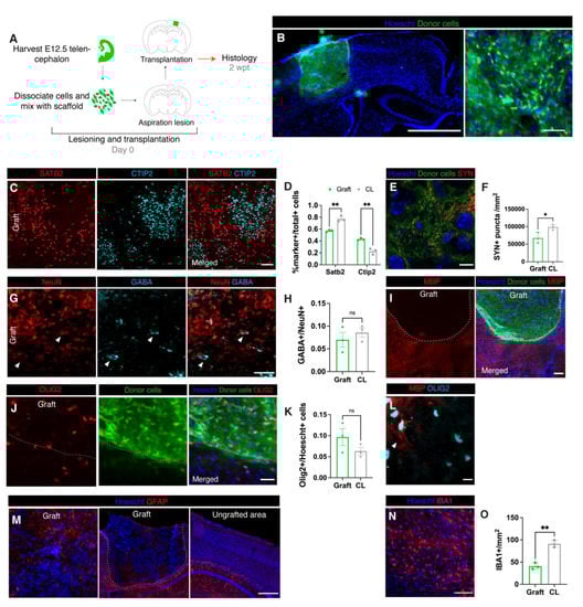 To begin assessing whether the lesion and scaffold combination supports donor cell engraftment, we transplanted dissociated mouse cortical cells harvested from embryonic day (E) 12.5 telencephalon. The E12.5 telencephalon contains the cell types needed for proper development, such as neuronal, vascular, and glial precursor cells, and therefore is a practical source of cells for a proof of concept for this transplant model (Figure 1A) []. In addition, we previously observed that E12.5 cortex-derived vascular, glial, and neuronal precursor cells survive, differentiate, and integrate with the adult mouse cortex []. To trace donor cells, we harvested E12.5 telencephalon from Foxg1cre/+; Rosa26CAG-loxSTOPlox-eGFP/+ mice, in which telencephalic cells are specifically labeled with GFP. Immediately after tissue dissociation, the donor cells were resuspended in the Matrigel:media solution with the addition of methylprednisolone, a corticosteroid known to decrease acute inflammation specifically in the context of brain transplantations []. Once the lesion was generated (in only one hemisphere of the neocortex), the site was rinsed with cold PBS until any bleeding ceased (usually 5–20 min). The cell/scaffold solution was then used to fill the lesion site, and the solution was gelled within 10–30 min. At 2 weeks post-transplantation (wpt), we assessed the cell type composition of the grafts and found that GFP+ cell bodies filled the entire space in the lesion and were not observed outside of the graft site (Figure 1B).