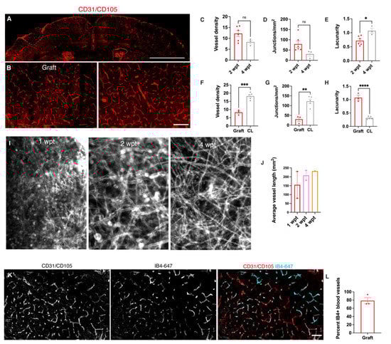 To determine whether the grafts become vascularized using the same experimental setup as in Figure 1A, we co-immunostained grafts with the vascular endothelial markers CD31 and CD105. At 2 wpt, vessels appear present throughout the grafts (Figure 2A,B). Vascularization is a dynamic process that occurs in response to hypoxic cues in the environment; therefore, we examined the graft vessels at a later time point []. The vessels in the graft appeared to still be changing their morphology until at least 4 wpt (Figure 2C–E). From 2 to 4 wpt, despite having similar densities (2 wpt 12.2% vessels % area, N = 6; 4 wpt 8.3% vessel % area, N = 3, p = 0.1) and numbers of junctions (2 wpt 79/mm2, N = 6; 4 wpt 30.1/ mm2, N = 3, p = 0.08), the grafts exhibited significantly increased lacunarity at 4 wpt, a measure of irregularity or gaps within the network that does not rely on vessel density or caliber [] (2 wpt 0.72, N = 6; 4 wpt 1.1, N = 3, p = 0.02). Consistent with ongoing maturation of graft vasculature over time, flattened Z-stacks acquired from 2-photon live imaging at 1, 2, and 4 wpt suggested that vessel length also increased between 1 and 4 wpt (Figure 2I,J).