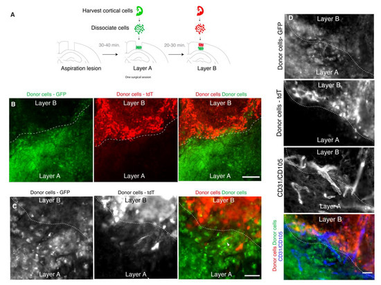 - Krzyspiak, J.; Yan, J.; Ghosh, H.S.; Galinski, B.; Lituma, P.J.; Alvina, K.; Quezada, A.; Kee, S.; Grońska-Pęski, M.; De Tai, Y.; et al. Donor-derived vasculature is required to support neocortical cell grafts after stroke. Stem Cell Res. 2022, 59, 102642. [Google Scholar] [CrossRef] [PubMed]