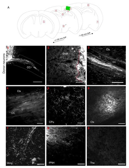 Mouse donor cells project to appropriate brain regions. (A): Diagram of areas in host brain that donor cells project to at 2 wpt. Projections are seen in (1). The corpus callosum (CC) exiting the graft (N = 6/9) (scale bar = 300 μM). (2). The cortex directly adjacent to the graft (N = 9/9) (scale bar = 80 μM). (3). The CC away from the graft towards the contralateral hemisphere (N = 6/9) (scale bar = 80 μM). (4). The CC in contralateral cortex (N = 6/9) (Scale bar = 40 μM). (5). The caudate putamen (CPu) (N = 3/9) (scale bar = 80 μM). (6). The posterior cortex (N = 2/9) (scale bar = 100 μM). (7). The lateral amygdala (lAmg) (N = 1/9) (scale bar = 200 μM). (8). The dorsal hippocampus (dHPC) (N = 2/9) (scale bar = 100 μM). (9). The thalamus (Thal) (N = 9/9) (scale bar = 100 μM).