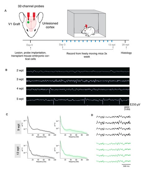 Mouse donor neurons become physiologically active. (A): Experimental design. (B): Neural traces of a single representative channel at 2, 3, 4, and 5 wpt with the same time and voltage scales. (C): LFP power spectrums of control (left panels) and graft (right panels) at 9 and 13 wpt. (D): LFP traces of control (gray) and graft (green) at 9 and 13 wpt.