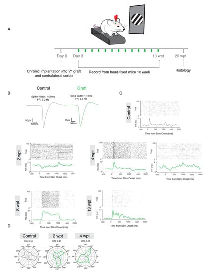 Mouse donor neurons respond to visual stimuli and are tuned to specific orientations. (A): Experimental design. (B): Representative waveforms of putative neurons from control (left:black) and graft (right:green). (C): Raster plots of firing rate and signal to noise ratio (SNR) at 2, 4, 8, and 13 wpt (from left to right, top to bottom). (D): OSI for control and graft at 2 and 4 wpt.
