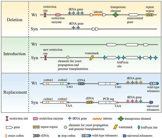 - Shen, Y.; Wang, Y.; Chen, T.; Gao, F.; Gong, J.; Abramczyk, D.; Walker, R.; Zhao, H.; Chen, S.; Liu, W.; et al. Deep functional analysis of synII, a 770-kilobase synthetic yeast chromosome. Science 2017, 355, 6329. [Google Scholar] [CrossRef] [PubMed]