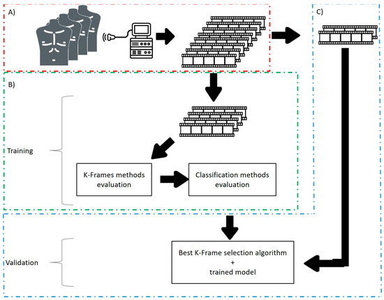 Main steps of the proposed work. (A) Data are acquired in the Emergency Department of the San Matteo Hospital to create a dataset of Lung UltraSound clips. (B) Part of these clips are selected as training set. These videos are also augmented to enlarge the training set. In this phase, different key-frames selection algorithm and classification techniques are evaluated. (C) The best key-frame selection algorithm and the best classifier are validated through the test set.