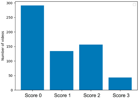 Fondazione IRCCS Policlinico San Matteo Hospital’s Emergency Department physicians oversaw the methodical procedure and ensured that the labeling was accurate. During the first part of the data collection and annotation process, they manually selected all clips from each patient, assessed the quality of each clip, and either proceeded to evaluate it based on the two scoring methodologies or discarded it. They reviewed each clip to assign a score and verify that SARS-CoV-2 pneumonia patterns, as described in Section 2.1, were present. The patient selection process was random and blinded to reject the hypothesis of biased outcomes. Some subjects may have received fewer LUS exams than others due to the detection of severe lung involvement in the early stages of the procedure. The entire annotation and collection process took longer than one month, resulting in 624 gathered clips based on the initial 5400 clips. Figure 2 shows the class distribution in the dataset, divided into four tiers.