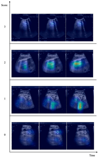 We used Grad-CAM to validate the network’s decision-making. The physicians evaluated whether the X3D correctly identified B-lines, pleural line abnormalities, or other patterns examined in the LUS scoring section, which is the procedure doctors use to assess patients’ health. Figure 3 shows the behavior of X3D in the most complex four-way classification task. We present the Grad-CAM results starting from the lowest score, indicating that the subject being considered is healthy, and approaching the highest score, indicating that the patient requires urgent respiratory assistance. The architecture accurately and thoroughly highlights all patterns, including A and B lines and small or large consolidations.
