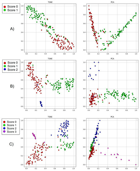 t-SNE and PCA results: (A) binary classification, (B) three-way classification, and (C) four-way classification.