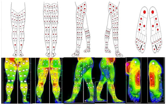 Digital infrared thermographic imaging (DITI) is a technique used to display the body’s surface temperature using thermography [,]. DITI has been used as a complementary diagnostic tool in various clinical fields [,,,,,,]. In several disorders involving the lower limbs, such as lumbar radicular pain, chronic regional pain syndrome, vascular disease, and peripheral nerve entrapment, DITI allows visualization of the affected area as hypo-radiant (hypothermia) or hyper-radiant (hyperthermia) compared to the unaffected area [,,,,,].