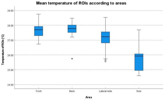 According to the location of the ROIs, the mean temperature of the ROIs was significantly different between the four areas (p < 0.001, ANOVA). In particular, the temperature of the sole area was significantly lower than that of any other areas; the difference between the sole and other areas was 1.93 (95% CI, 1.53–2.33), 1.95 (95% CI, 1.57–2.32), and 1.41 (95% CI, 1.08–1.74), respectively (p < 0.001, ANOVA post hoc analysis) (Figure 2).
