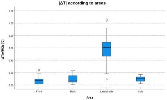 Based on the results of this study, |ΔT| increased toward the distal part in the front area only, but not in other areas. Furthermore, |ΔT| was within 0.2 °C in the sole area and it was measured as higher than 0.2 in the lateral-side area. In contrast, some authors have suggested that |ΔT| increases toward the distal part of the body and that the normal range of |ΔT| can be larger than 0.2 °C in the periphery [,]. As a result, previous findings are controversial, and it is necessary to be careful about the interpretation of the significance of |ΔT| depending on the area.