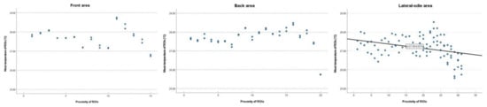 Relation between the mean temperature of the region of interest (ROIs) and the proximity of ROIs in three areas according to regression analysis. Front area temperature = 27.871 − (0.023 × ROIs) (p = 0.260, R2 = 0.045); back area temperature = 27.792 − (0.009 × ROIs) (p = 0.569, R2 = 0.009); lateral-side area temperature = 27.595 − (0.023 × ROIs) (p = 0.001, R2 = 0.114).