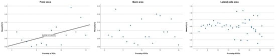 Relation between the absolute values of difference between both sides (|ΔT|, |right—left|) and the proximity of region of interest in each of the three areas according to regression analysis. |ΔT| front area = 0.008 + (0.008 × ROIs) (p = 0.047, R2 = 0.270); |ΔT| back area = 0.090 + (9.774 × 10−5 × ROIs) (p = 0.972, R2 = 0.000); |ΔT| lateral-side area = 0.645 − (0.004 × ROIs) (p = 0.327, R2 = 0.023).