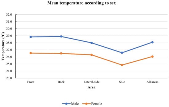 The mean temperature of each area depending on the sex was as follows: in the front area, the mean temperature was 28.83 ± 5.15 (ranged from 27.10 ± 5.16 to 32.02 ± 4.85) in males and 26.54 ± 5.53 (ranged from 24.03 ± 5.16 to 29.32 ± 5.66) in females; in the back area, the mean temperature was 28.90 ± 5.18 (ranged from 25.99 ± 5.05 to 31.84 ± 4.65) in males and 26.50 ± 5.61 (ranged from 22.86 ± 4.86 to 28.74 ± 5.59) in females; in the lateral-side area, the mean temperature was 27.99 ± 5.45 (ranged from 25.32 ± 5.25 to 32.15 ± 4.71 in males and 26.29 ± 5.55 (ranged from 22.89 ± 4.95 to 29.02 ± 5.58) in females; in the sole area, the mean temperature was 26.59 ± 4.87 (ranged from 25.32 ± 5.08 to 30.36 ± 5.03) in males and 24.85 ± 5.03 (ranged from 22.19 ± 4.69 to 28.21 ± 5.40) in females; and in all areas, the mean temperature was 28.08 ± 5.16 in males and 26.05 ± 5.43 in females (Table 1).