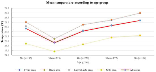 The mean temperature of each area depending on the age group was as follows: in the 20s age group, the mean temperature was 27.34 ± 5.17 (ranged from 24.14 ± 4.69 to 29.33 ± 5.21); in the 30s age group, the mean temperature was 25.82 ± 5.37 (ranged from 22.19 ± 4.69 to 28.95 ± 5.74); in the 40s age group, the mean temperature was 26.21 ± 5.71 (ranged from 23.74 ± 5.30 to 30.00 ± 5.43); in the 50s age group, the mean temperature was 27.65 ± 5.11 (ranged from 24.67 ± 5.16 to 30.84 ± 4.95); in the 60s age group, the mean temperature was 28.20 ± 5.29 (ranged from 25.06 ± 5.34 to 32.15 ± 4.85) (Table 5).
