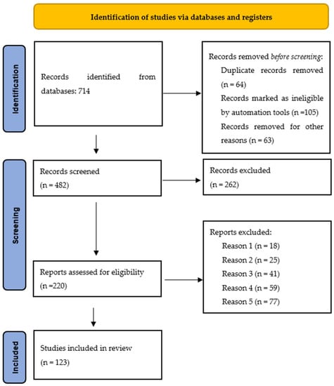 Out of the five selected databases, 714 potentially suitable articles were sorted. An overall amount of 482 studies were included after eliminating the repeating ones. After reading the abstracts, 263 works were dropped as they did not contain sufficient data and/or due to different study strategies. As a result, 219 complete articles were analysed, and then only 120 full-text articles were selected. Figure 2 demonstrates the PRISMA flow chart for the selection process of articles included in this systematic review.