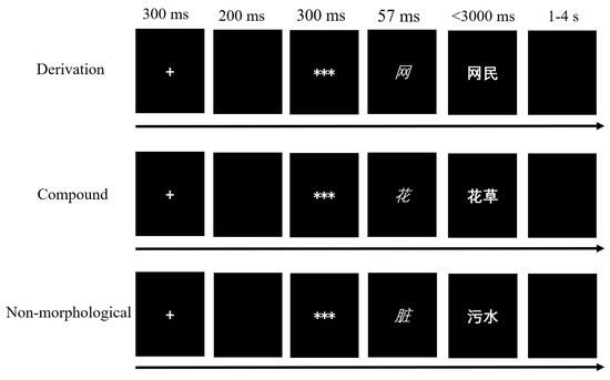 The visual lexical decision task was adapted from the morphological priming paradigm with a short SOA [3] and a masked priming technique [62]. E-prime was used to program the materials and procedures (Figure 1), in which a white fixation was first presented in the screen center of a PC for 300 ms, followed by a blank of 200 ms. And then a series of asterisks serving as the mask were presented for 300 ms, and subsequently, the mask would be replaced by the prime lasting for 57 ms. After the prime disappeared, participants would read the target and decide whether the displayed character string is a real Chinese word or not by pressing the corresponding buttons labelled as “yes” or “no” in the keyboard as quickly as possible. If they failed to react within three seconds, it would be marked as a wrong response automatically by the task. After the response, there would be blank jittered from one to four seconds [64]. All primes were presented with the italic Kaiti typeface and a size of 40, whereas targets were displayed with the bold SimHei at 40. Ten practice trials with correctness feedback were offered before the formal experimental tests.