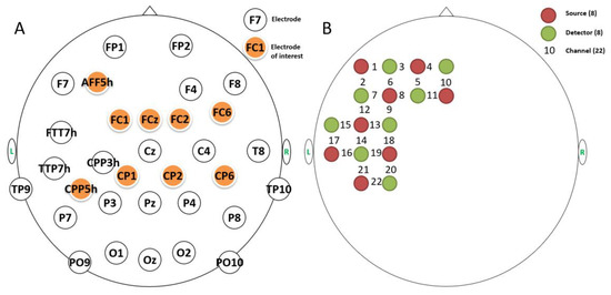 The layout of fused EEG-fNIRS arrangement. (A) There were 32 electrodes in total, nine of which (in orange) were used for further ERP analysis. (B) Eight light sources and 8 detectors generated 22 fNIRS channels, covering the frontal and temporal regions of the left hemisphere.