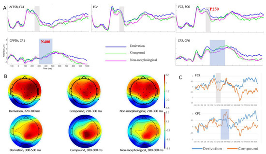 Visualization of ERP results. (A) Grand averaged ERPs over the frontal electrodes (the first row) demonstrating P250 effect (in grew shades), and centro-parietal sites (the second row) manifesting N400 activities (in blue shades). (B) Brain topographies of P250 (the first row) and N400 (the second row) across three conditions. (C) Difference waves for Derivation vs. Control (in blue), and Compound vs. Control (in orange) at electrodes FC2 and CP2, respectively. The time windows of P250 and N400 were shaded in grey and blue, respectively.