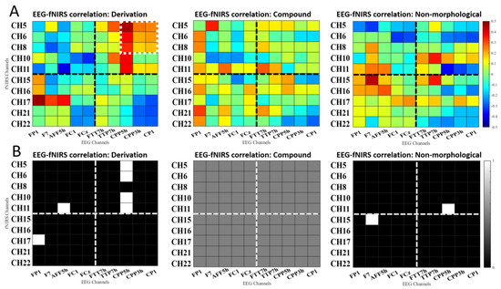 - Gao, F.; Wang, R.; Armada-da-Silva, P.; Wang, M.-Y.; Lu, H.; Leong, C.; Yuan, Z. How the brain encodes morphological constraints during Chinese word reading: An EEG-fNIRS study. Cortex 2022, 154, 184–196. [Google Scholar] [CrossRef]