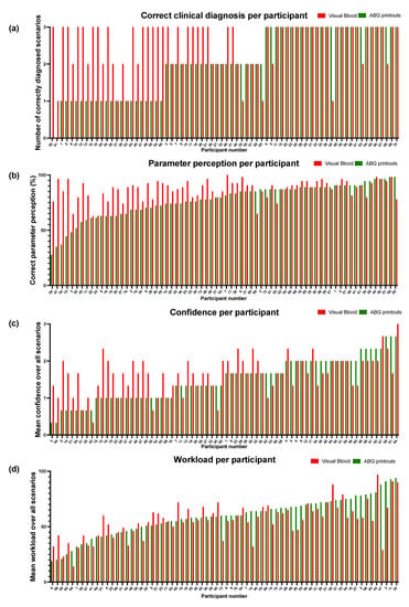 The study results on an individual participant level for correct clinical diagnosis, parameter perception, perceived confidence, and workload. The 70 participants are ranked on the x-axis from left to right in ascending order according to their achieved diagnostic and parameter perception performance, perceived confidence, or workload, respectively, with conventional ABG printout.